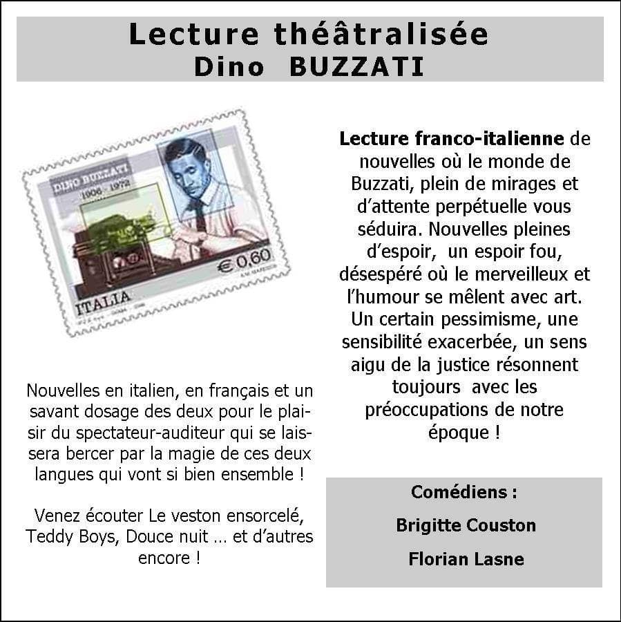 L’association Amitié Franco-Italienne Saint-Péray Asso organise le Vendredi 15 novembre à 20h avec le soutien de la Cie Zinzoline une lecture théâtralisée DINO BUZZATI par les comédiens Brigitte Couston et Florian Lasne